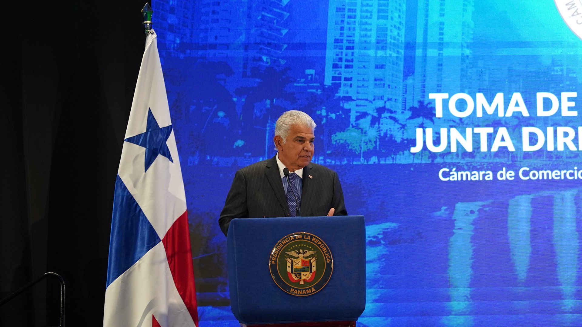 El presidente de la República, José Raúl Mulino durante el acto de toma de posesión de Aurelio Barría Pino, en…